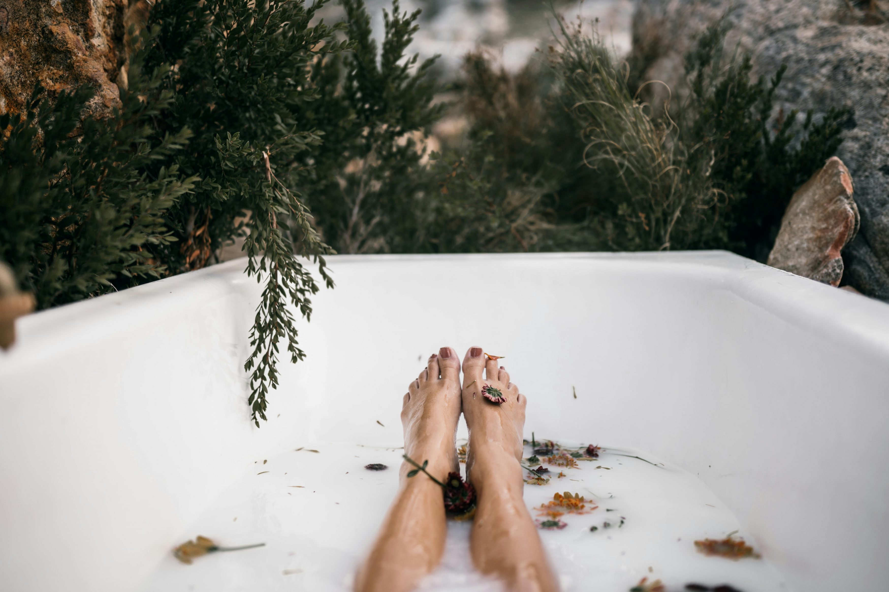 Stelle den Topf anschließend zur Seite und lasse das Fußbad etwa 30 Minuten abkühlen, bis es angenehm warm ist. Danach tauchst du deine Füße in das Bad und lässt sie etwa 20 bis 30 Minuten darin entspannen, damit die pflegenden Wirkstoffe ihre Wirkung entfalten können.